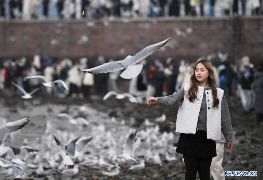 [신화망 칭다오 12월15일] 겨울이 되자 산둥(山東)성 칭다오(靑島)시 잔차오(棧橋) 관광지에 많은 갈매기가 날아들며 장관이 연출됐다.