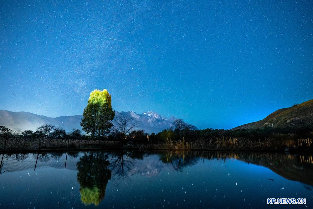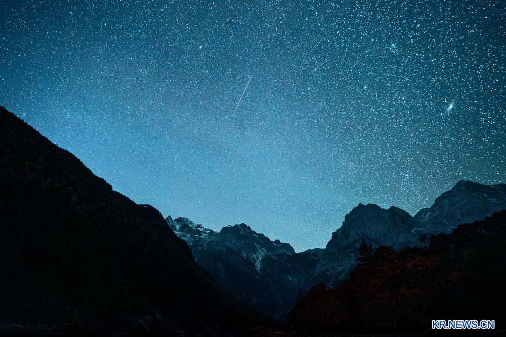 [신화망 리장 12월15일] 14일 새벽 윈난(雲南)성 리장(麗江)시 위룽(玉龍)설산에서 포착한 쌍둥이자리 유성우.