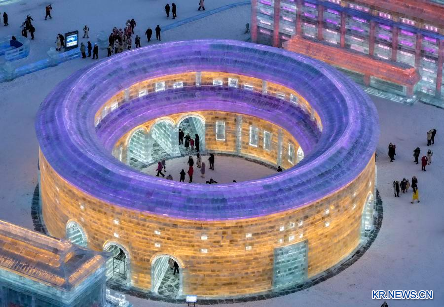 하얼빈(哈爾濱) 빙설대세계 단지 내 빙설 조각물을 17일 드론으로 촬영했다. (사진/신화통신)