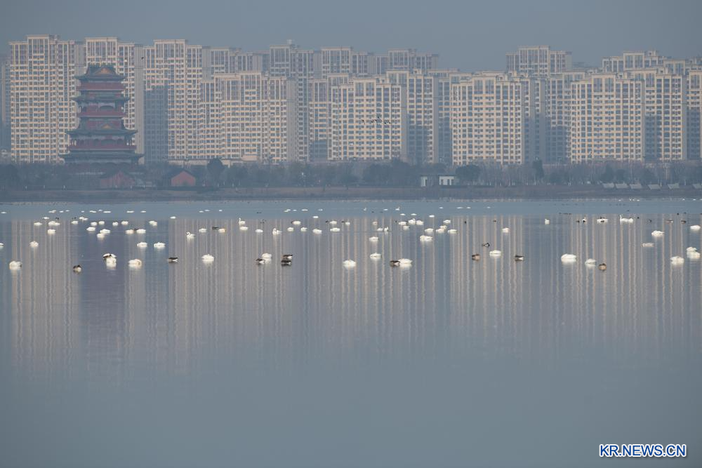 지난 16일 안후이(安徽)성 추저우(滁州)시 밍후(明湖)공원 호수에서 백조 등 철새들이 유영하고 있다.