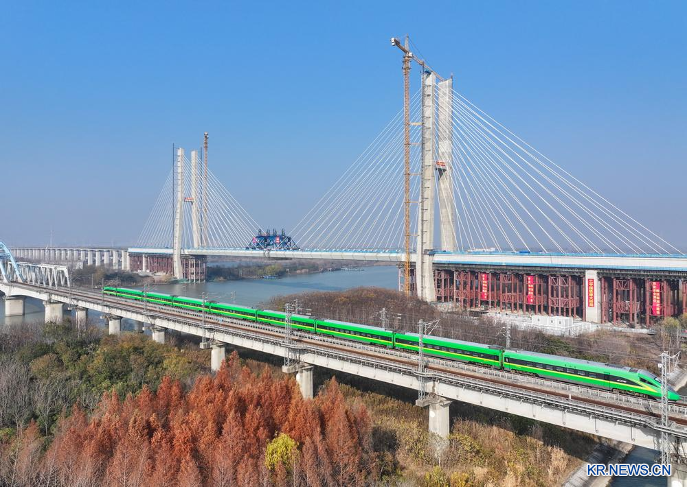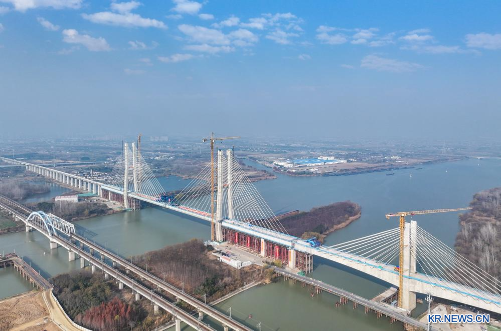 [신화망 양저우 12월20일] 후위룽(滬渝蓉·상하이~충칭~청두)고속철도 퉁타이양(通泰揚) 특대교의 징항(京杭·베이징~항저우)운하 횡단 사장교가 19일 성공적으로 연결됐다. 장쑤(江蘇)성 양저우(揚州)시에 위치한 해당 사장교의 총 길이는 564.3m, 주경간 길이는 300m에 달한다.