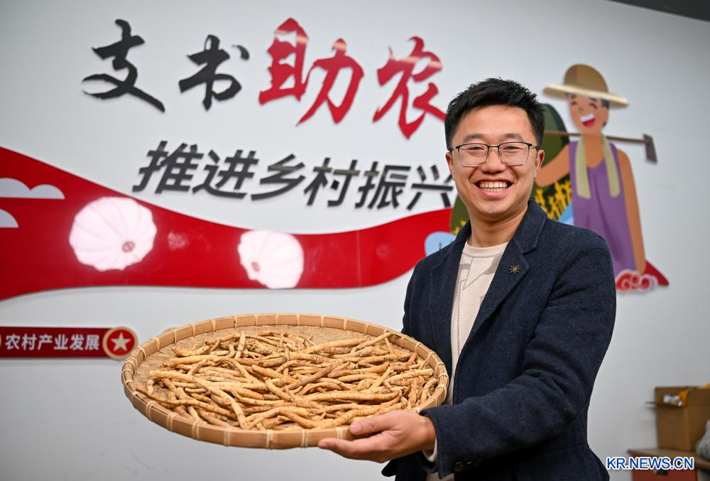 지난 12일 쓰촨(四川)성 창시(蒼溪)현의 한 디지털 산업단지에서 셰아이쥔(謝艾軍) 싱화(興華)촌 간부가 라이브 방송을 통해 특산물을 소개하고 있다.