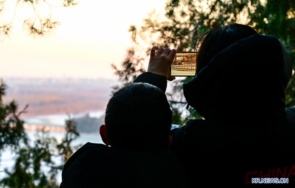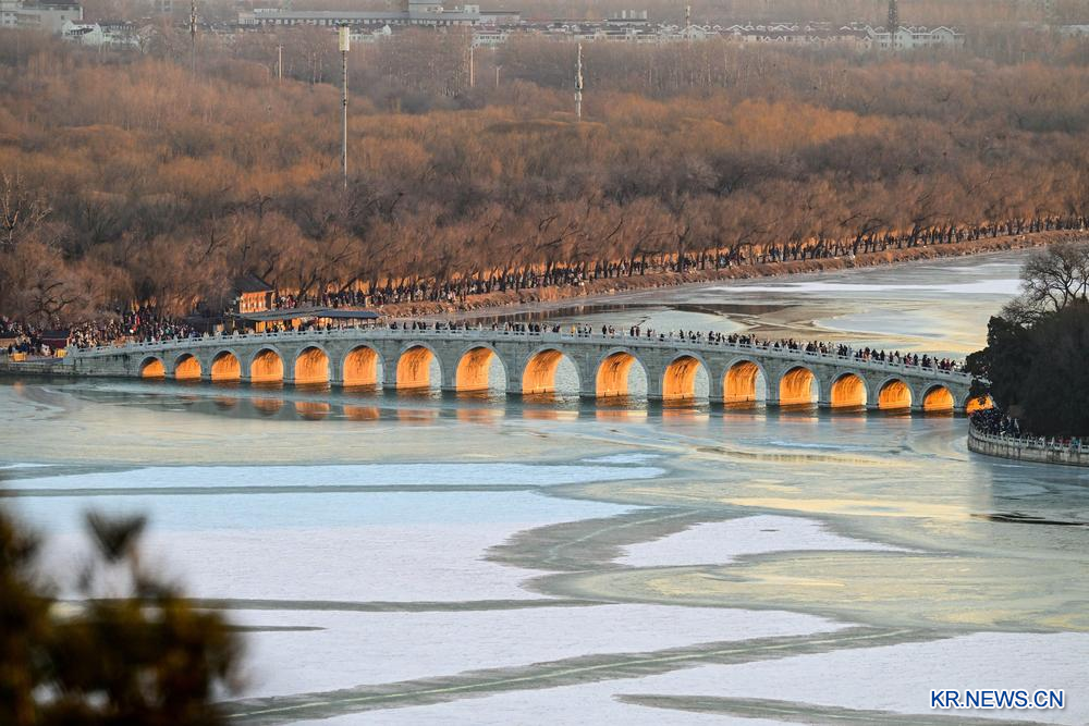 절기상 동지(冬至)인 이날, 석양이 이화원 십칠공교(十七孔橋)를 비춰 뿜어져 나온 '금광천동'의 경관이 관광객과 사진 애호가의 발길을 이끌었다. 2025.12.21