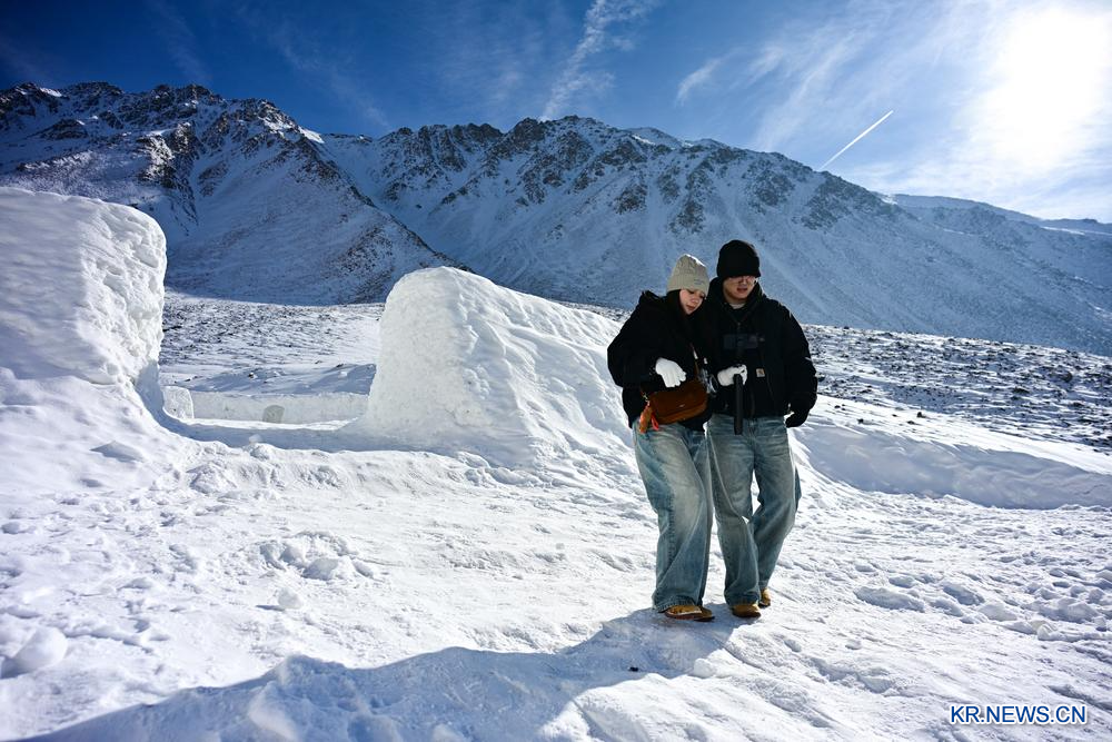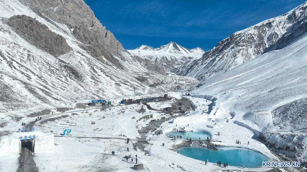 관광객들이 25일 칭하이(青海)성 하이베이(海北)짱(藏)족자치주 먼위안(門源)후이(回)족자치현의 강스카(崗什卡)설봉 관광지를 구경하고 있다.