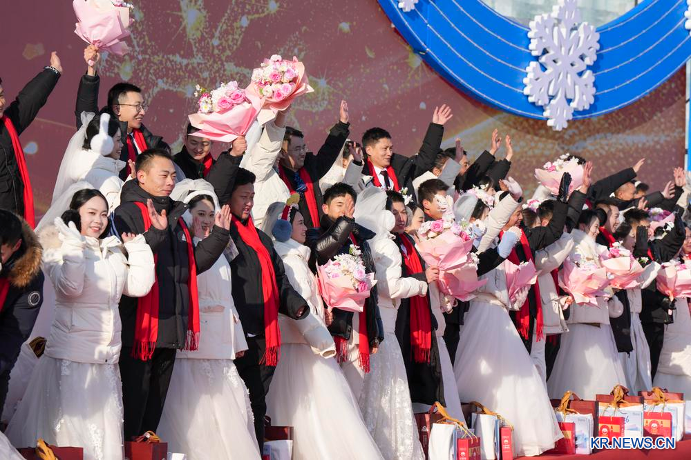 이날 하얼빈 빙설대세계 단지에서 열린 하얼빈 제42회 공익 빙설 단체 결혼식 현장. 2026.1.6
