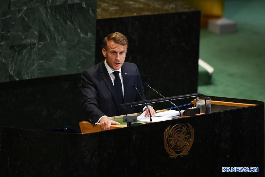 2025년 9월 22일 미국 뉴욕에 위치한 유엔(UN)본부에서 연설하고 있는 에마뉘엘 마크롱 프랑스 대통령. (사진/신화통신)