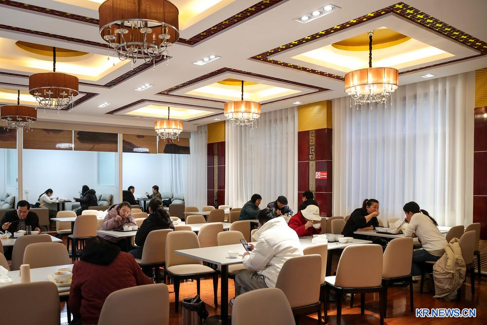[신화망 룽난 1월19일] 17일 한 근로자가 간쑤(甘肅)성 량당(兩當)현에 위치한 량당호텔 공유 식당에서 식사를 마치고 나오고 있다.