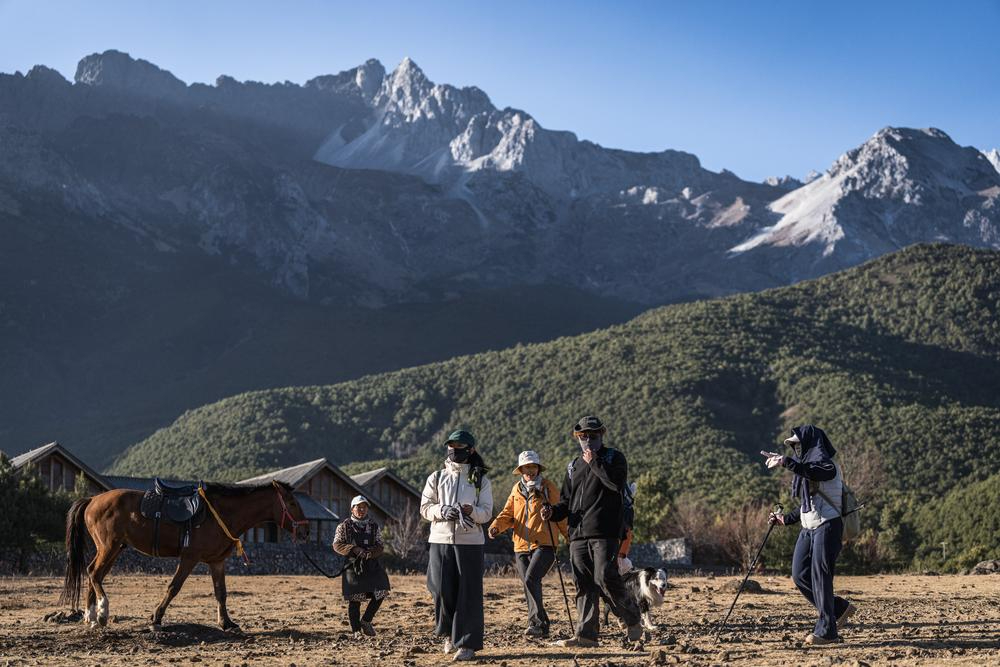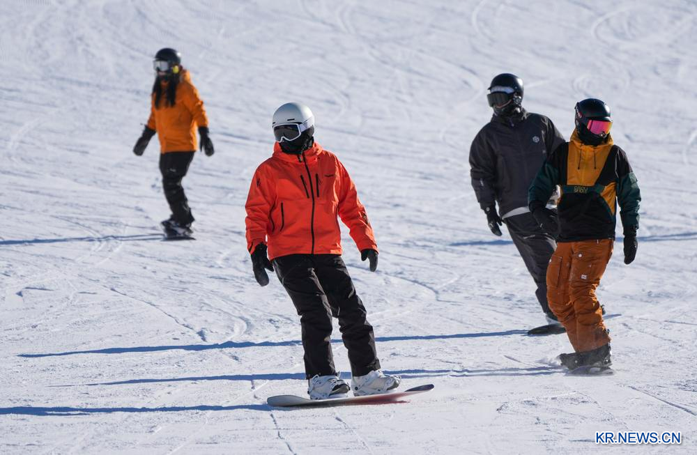 지난 17일 신장(新疆) 아러타이(阿勒泰) 커커퉈하이(可可託海) 국제스키리조트에서 보드를 즐기는 사람들.
