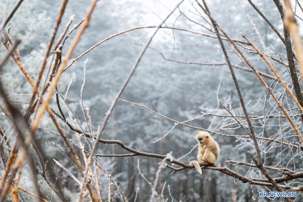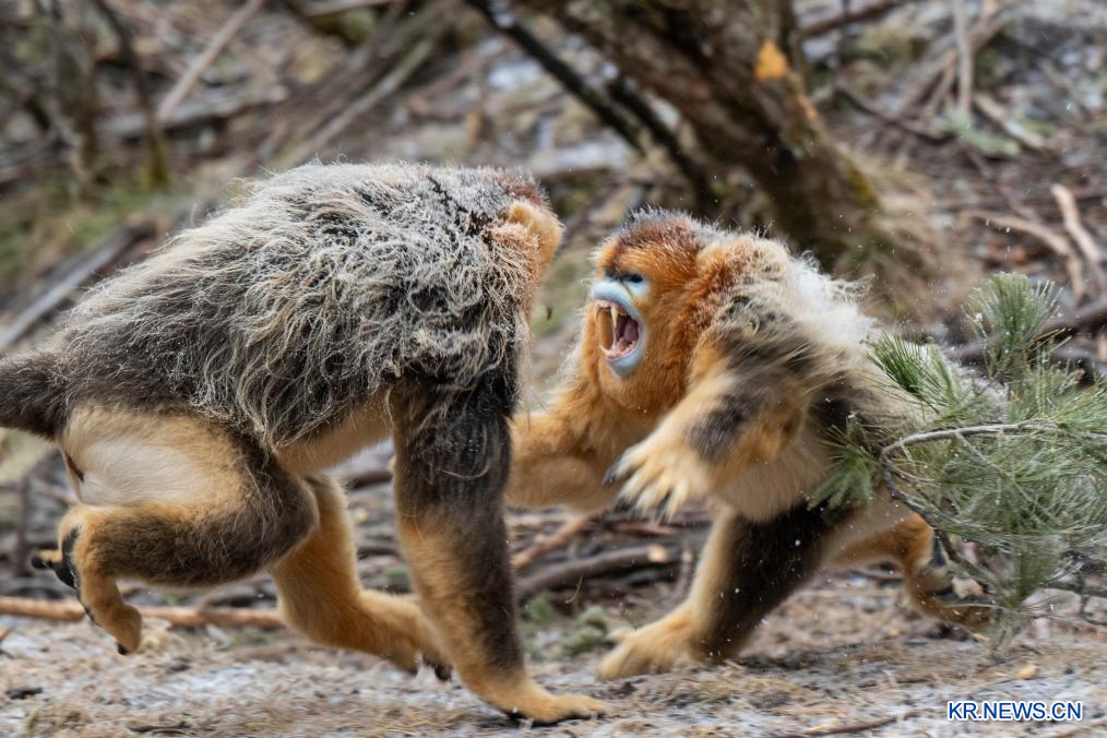 최근 후베이(湖北)성 선눙자(神農架) 삼림 지역에 눈이 내린 뒤 황금들창코원숭이(金絲㺅, 이하 황금원숭이) 무리가 눈밭에서 놀거나 먹이를 찾거나 쉬는 모습이 포착됐다. 조사 결과 선눙자 삼림 지역에는 현재 11개의 황금원숭이 개체군이 분포해 있고 개체수는 1618마리이며 서식지 면적은 401㎢인 것으로 나타났다.[촬영/신화통신 기자 우즈쭌(伍志尊)]