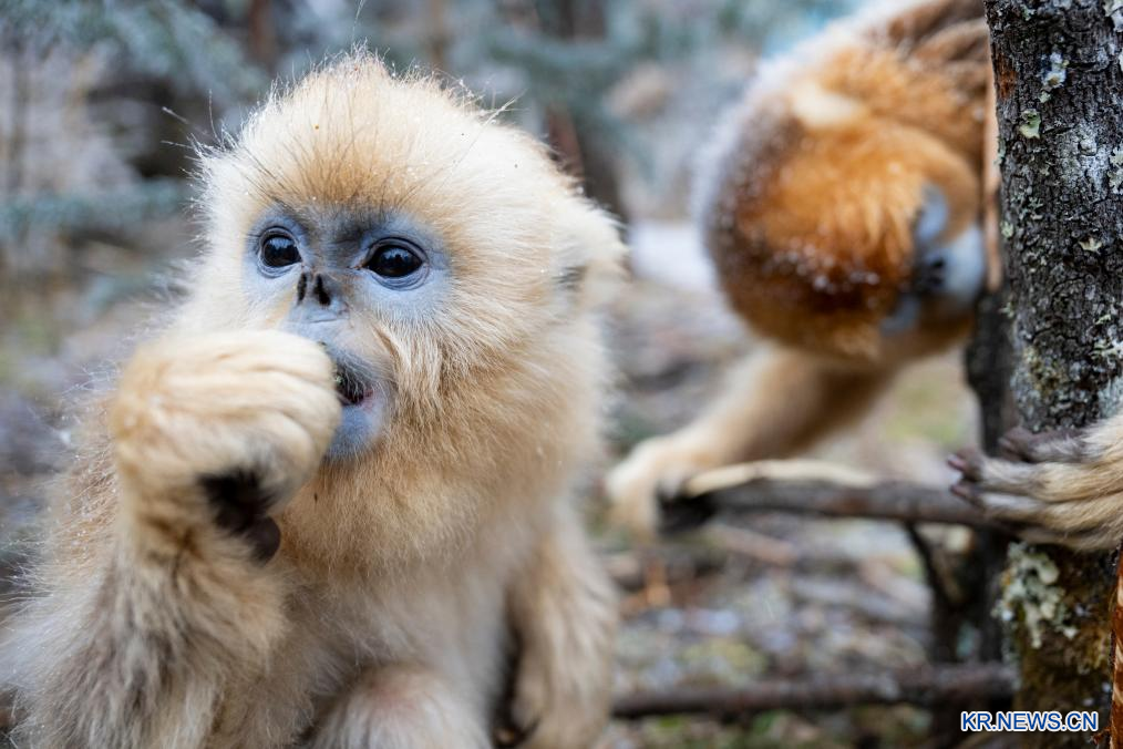 선눙자(神農架) 국립공원 다룽탄(大龍潭) 황금들창코원숭이 야외 연구기지 산림에서 황금들창코원숭이가 활동하고 있다.2026.1.19