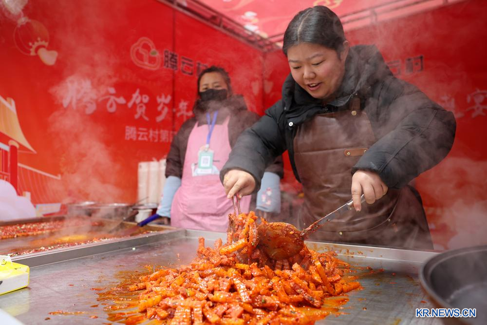 19일 한 노점상이 춘절맞이 용품 플리마켓에서 지역 특색 음식을 만들고 있다.