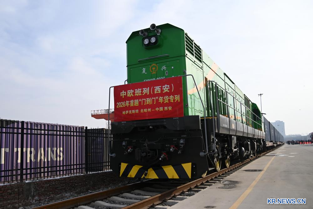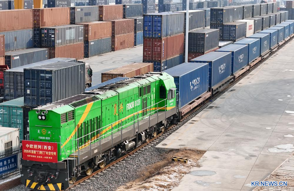 [신화망 중국 시안 1월22일] 2026년 첫 번째 중국-유럽 화물열차(시안) '도어투도어' 춘절맞이 용품 전용 열차가 21일 카자흐스탄의 농산물을 가득 싣고 시안(西安)에 도착했다. 올해로 3년째 운행되는 해당 열차는 해외 창고에서 중국 국내 창고로 화물을 운송하는 '도어투도어' 방식을 통해 화물 운송 효율을 높이고 기업의 운송 비용을 절감했다.