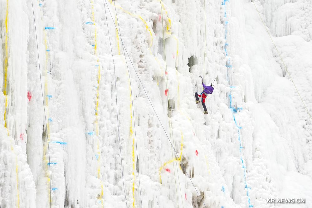 빙벽 등반 애호가 류신(劉新)이 25일 칭하이(青海)성 시닝(西寧)시 다헤이거우(大黑溝) 관광지에서 빙벽을 등반하고 있다.