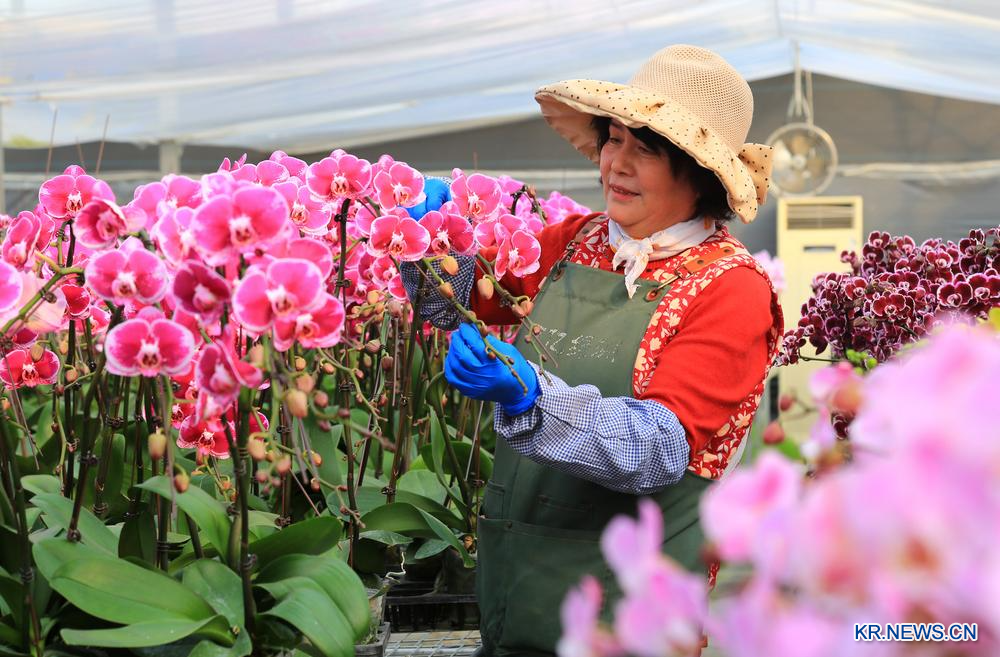 농가가 25일 산동(山東)성 칭다오(青島)시 지모(即墨)구 링산(靈山) 화훼∙문화 산업단지에서 꽃을 가꾸고 있다.