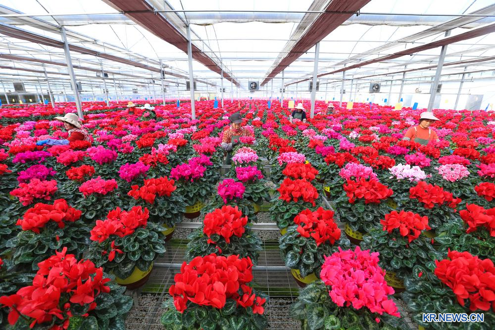 [신화망 지난 1월26일] 춘절(春節·음력설)이 다가오면서 산동(山東)성 칭다오(青島)시 지모(即墨)구 링산(靈山) 화훼∙문화 산업단지가 춘절맞이 꽃(年宵花)의 생산∙판매 성수기에 접어들었다.
