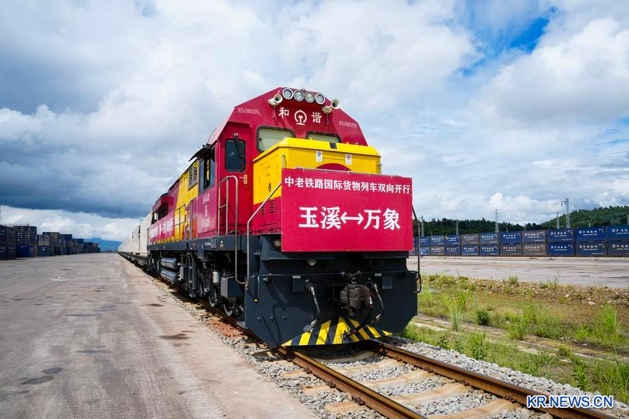 지난 2025년 8월 23일 라오스 비엔티안으로 발차 준비 중인 국제 화물열차가 윈난(雲南)성 위시(玉溪)시에 있는 중국-라오스 철로 옌허(硏和)역에 정차해 있다. (사진/신화통신)
