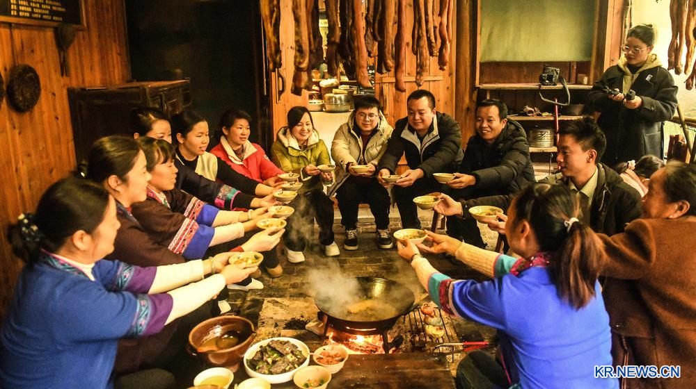 이날 라바제(臘八節∙음력 12월 8일)를 맞이해 싼장둥족자치현의 둥족 주민들이 산채에 모였다. 이들은 유차를 마시고 츠바(糍粑∙찐 찹쌀을 으깨서 만든 음식)와 찹쌀밥을 만들며 라바제를 즐겼다. 2026.1.26