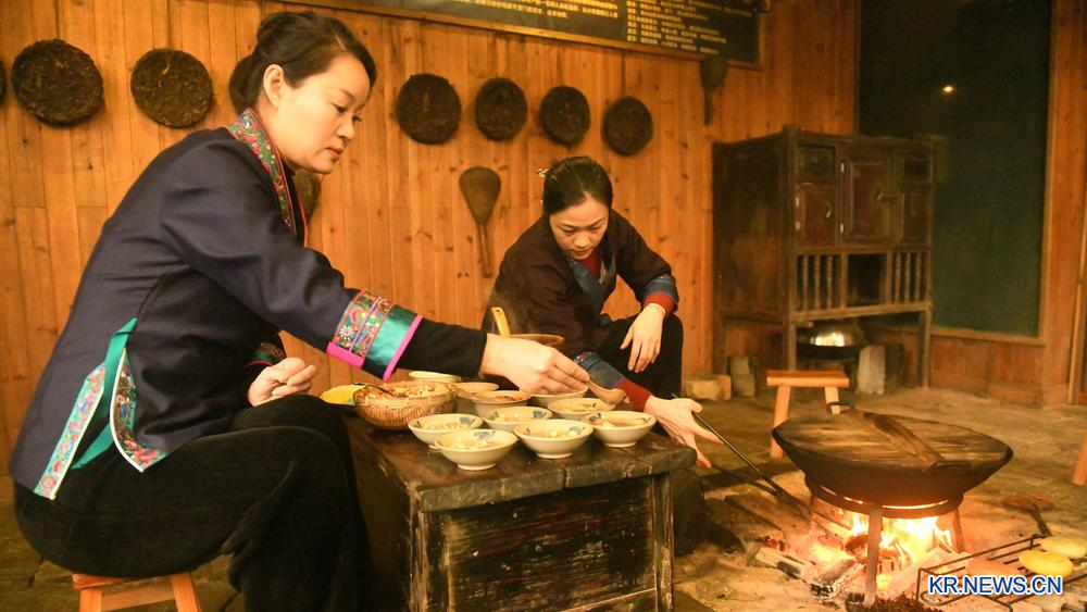 [신화망 싼장 1월27일] 26일 광시(廣西)좡족자치구 싼장(三江)둥(侗)족자치현 야린(牙林)촌의 둥족 주민들이 화로 앞에서 유차(油茶)를 우리고 있다.
