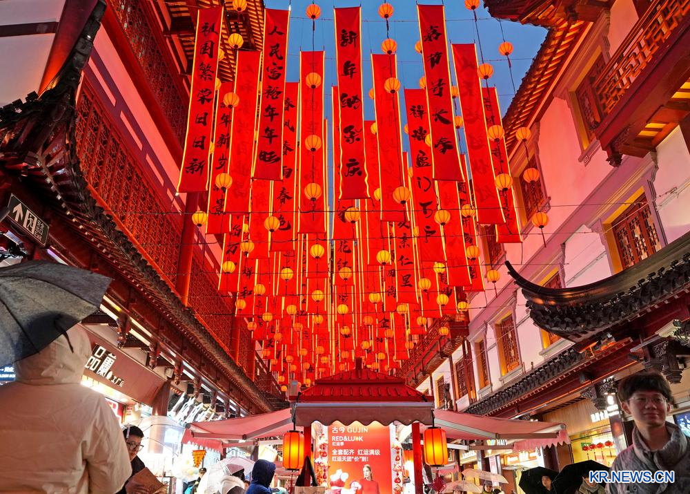 26일 예원상성(豫園商城) 센터광장에서 관광객들이 말의 해 테마 등불을 구경하고 있다.