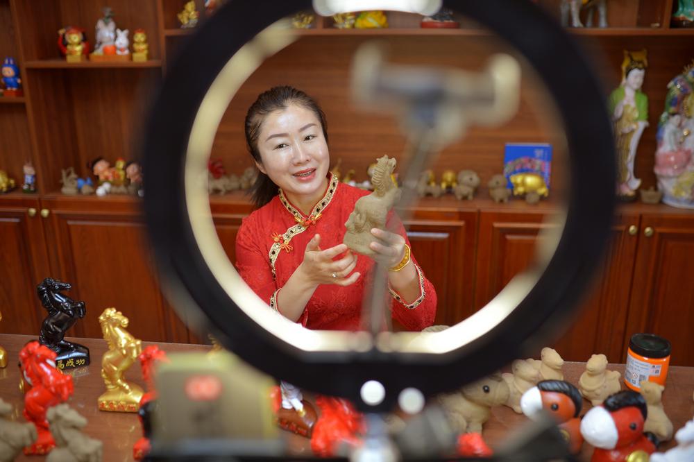 21일 산둥성 칭다오(靑島)시 청양(城陽)구에 위치한 한 흙인형 무형문화유산 공방에서 라이브 방송 중인 수공예 장인. 2026.1.27