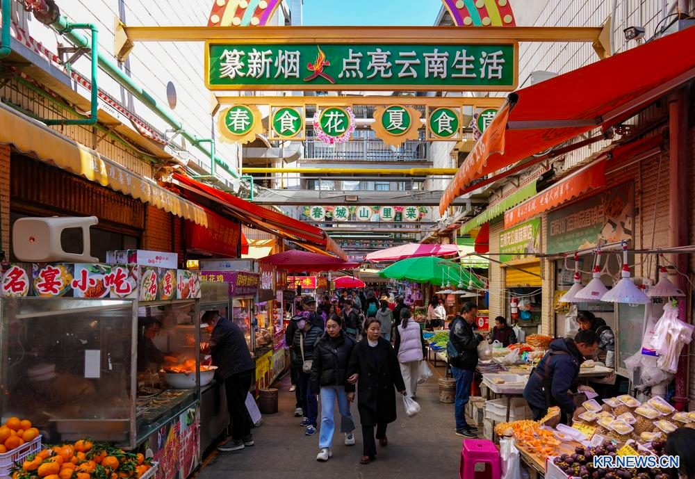 [신화망 쿤밍 1월28일] 윈난(雲南)성 쿤밍(昆明)시에 위치한 다관좐(大觀篆) 신농산물시장은 문화·관광 융합을 통해 문화 체험, 미식 소비, 레저·엔터테인먼트가 일체화된 다차원 공간으로의 전환을 추진해 윈난의 특색을 보여주는 창구로 거듭났다. 시장에는 600여 개의 상점이 있으며 하루 평균 방문객은 약 5만 명(연인원)에 달한다.