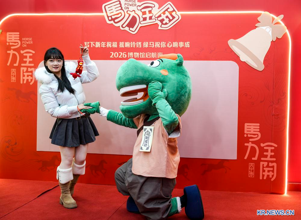 [신화망 중국 란저우 1월28일] 26일 저녁 간쑤(甘肅)성 박물관 1층 로비에서 '마답비연(馬踏飛燕)' 지식재산권(IP) 인형과 상호작용하는 관람객.
