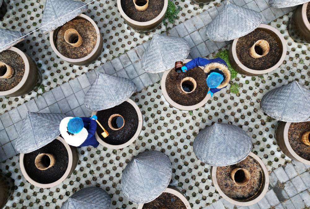 29일 텅저우시에 위치한 한 전통 간장 양조 기업의 건조장에서 간장을 숙성시키고 있는 작업자들. 2026.1.29