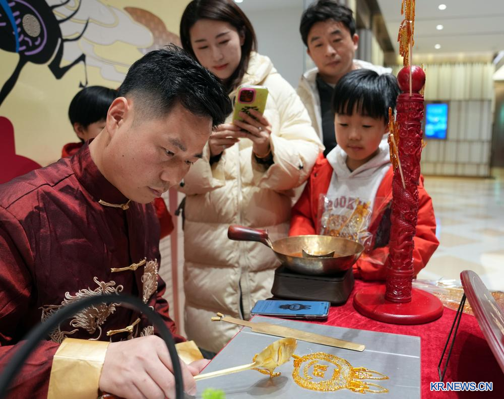 1일 저녁 상하이 BFC 와이탄(外灘) 금융센터 쇼핑몰에서 한 수공예 장인이 인형 탕화(糖畫·설탕 그림)를 만들고 있다.