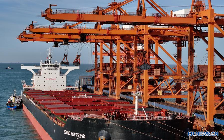 지난달 13일 허베이(河北)성 탕산(唐山)항 차오페이뎬(曹妃甸)항구구역 광석부두에서 한 선박이 하역하는 모습을 드론으로 담았다. (사진/신화통신)