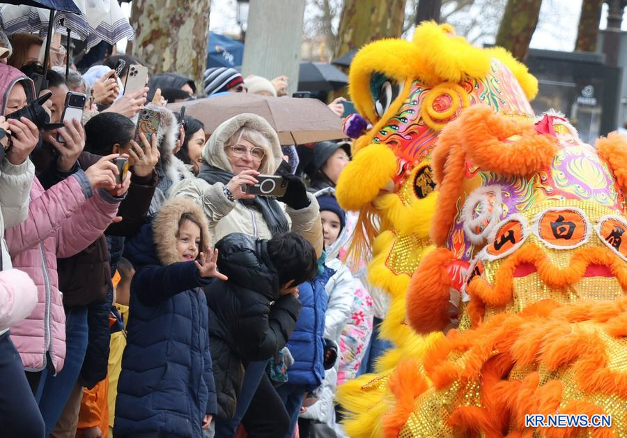 지난 1일 프랑스 파리 샹젤리제 거리서 열린 춘절(春節·음력설) 기념 퍼레이드에서 시민들이 사자춤 공연을 관람하고 있다. (사진/신화통신)