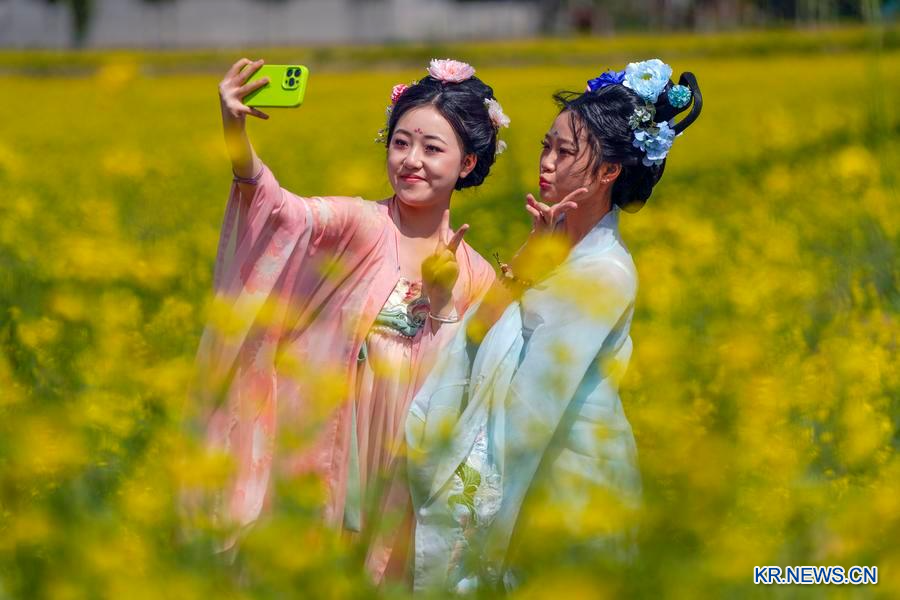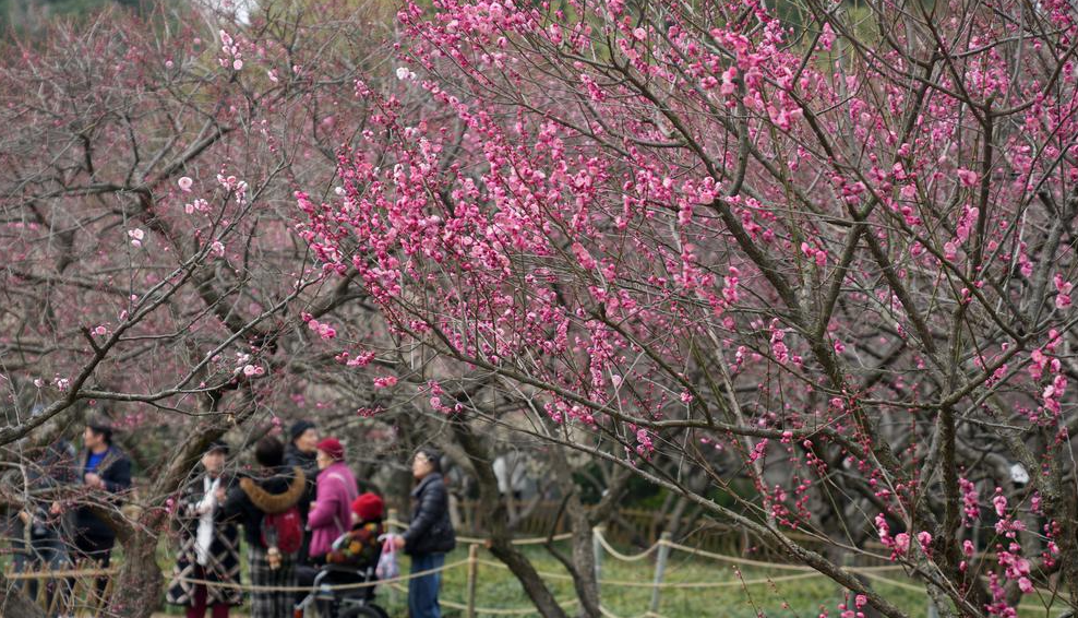 [신화망 베이징 2월5일] 장쑤(江蘇)성 쑤저우(蘇州)시의 한 정원, 전통 문양의 문 너머로 네 살배기 아이가 복숭앗빛 망토와 수놓은 치마를 입고 빙글빙글 돌고 있다.