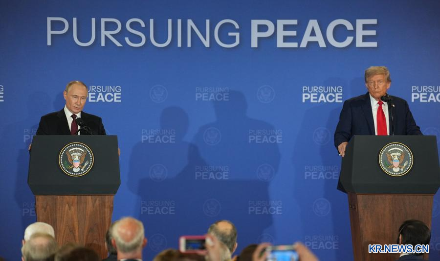 지난해 8월 15일 미국 알래스카주 앵커리지시 엘먼도프 리처드슨 합동기지에서 회담을 진행한 후 공동 기자회견에 참석한 도널드 트럼프 미국 대통령(오른쪽)과 블라디미르 푸틴 러시아 대통령. (사진/신화통신)