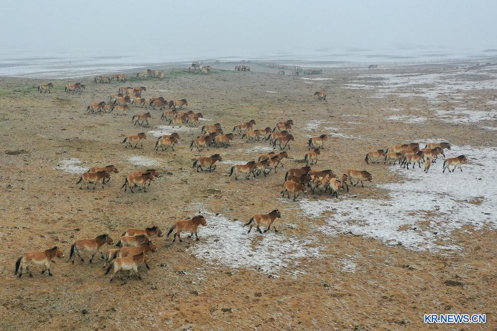 지난 4일 신장(新疆) 카라마이리산(卡拉麥里山) 야생동물 자연보호구 관리센터 내 프르제발스키 말떼를 드론 사진에 담았다. 2026.2.7