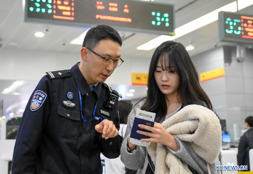 상하이 푸둥(浦東) 국제공항 변방검사소 민경이 11일 한국 관광객의 입경 정보 작성을 도와주고 있다.