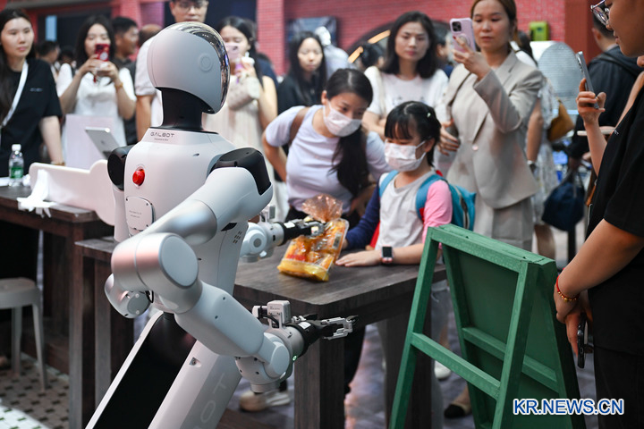 소매 판매 매장에서 응용 가능한 인허(銀河)범용로봇(Galbot∙갤봇)의 로봇이 지난해 7월 26일 상품 판매 기능을 시연하고 있다. (사진/신화통신)