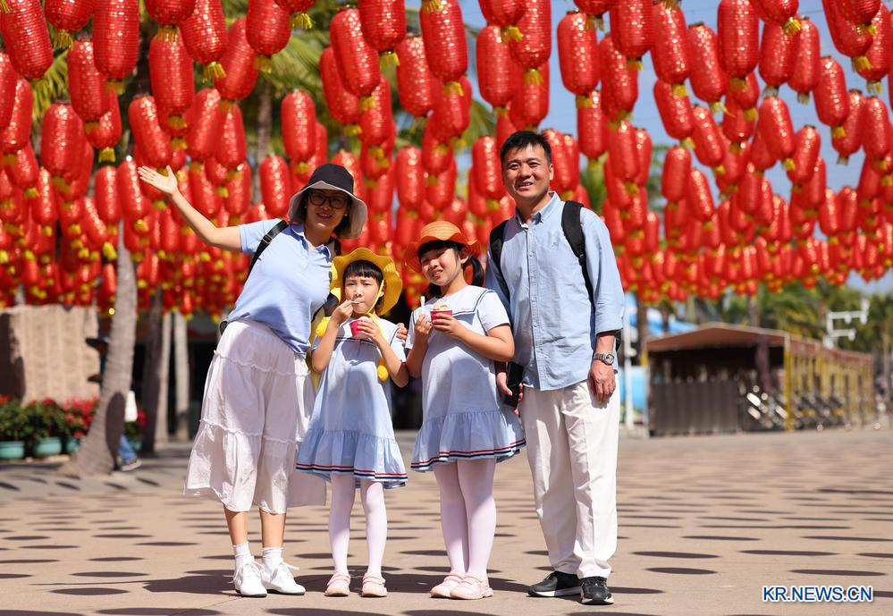 12일 하이난(海南)성 싼야(三亞)시 난산(南山)문화관광구에 설치된 춘절(春節·음력설) 장식을 배경으로 기념사진 찍는 나들이객.