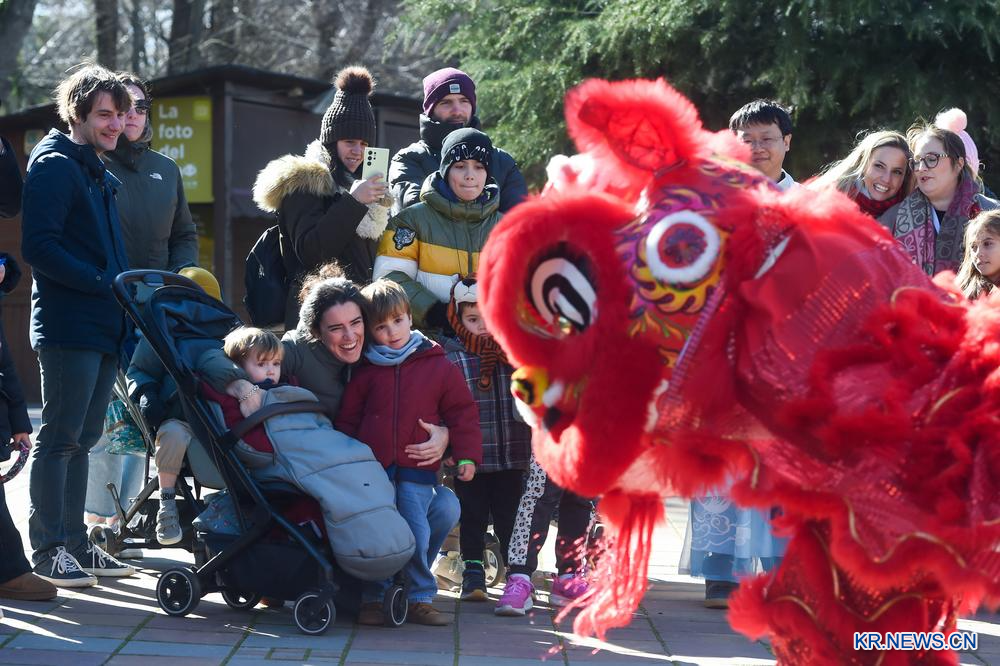 [신화망 마드리드 2월16일] 14일 스페인 마드리드 동물원을 찾은 사람들이 사자춤 공연을 관람하고 있다.