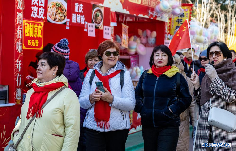 지난 17일 베이징 룽탄후(龍潭湖) 공원에서 춘절 문화 묘회(廟會, 옛날 절 부근에 임시로 섰던 장터)를 둘러보는 외국인 관광객. 2026.2.19