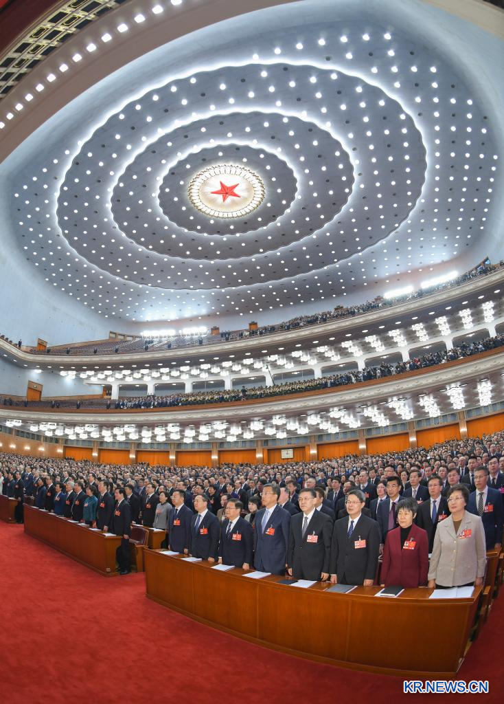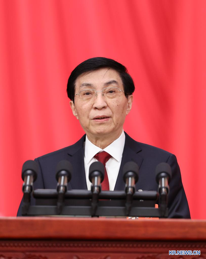 왕후닝 전국 정협 주석이 정협 제14기 전국위원회 상무위원회를 대표해 업무보고를 하고 있다.