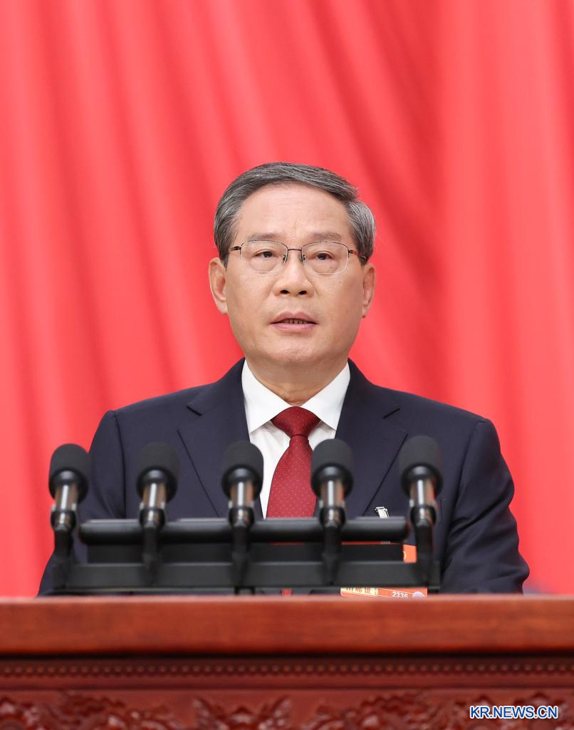 제14기 전국인민대표대회(전인대) 제4차 회의 개막회가 5일 베이징 인민대회당에서 열렸다.리창(李强) 중국 국무원 총리가 정부업무보고를 하고 있다. [촬영/신화통신 기자 황징원(黄敬文)]pagebreak