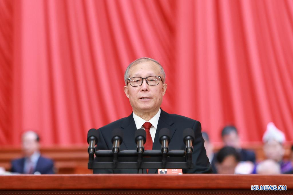 제14기 전국인민대표대회(전인대) 제4차 회의 개막회가 5일 베이징 인민대회당에서 열렸다. 리훙중(李鴻忠) 전인대 상무위원회 부위원장이 전인대 상무위원회의 위임을 받아 중화인민공화국 생태환경법전 초안에 관한 설명, 중화인민공화국 민족단결진보 촉진법 초안에 관한 설명, 중화인민공화국 국가발전계획법 초안에 관한 설명을 하고 있다. [촬영/신화통신 기자 딩하이타오(丁海濤)]pagebreak