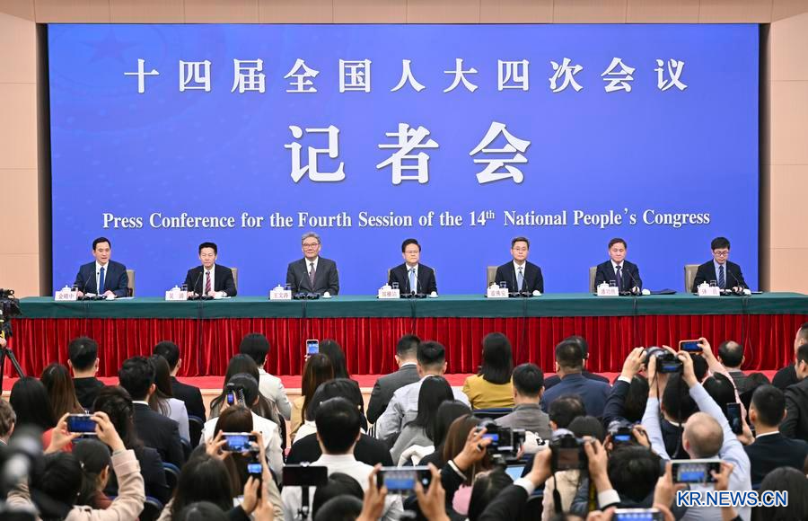 [신화망 베이징 3월7일] 제14기 전국인민대표대회(전인대) 제4차 회의 기자회견이 6일 베이징 메이디야(梅地亞)센터에서 열렸다. 중국 국가발전개혁위원회(발개위), 재정부, 상무부, 중국인민은행, 중국증권감독관리위원회 등 다섯 부처의 주요 책임자들이 한자리에 모여 내외신 기자들의 질문에 답했다.