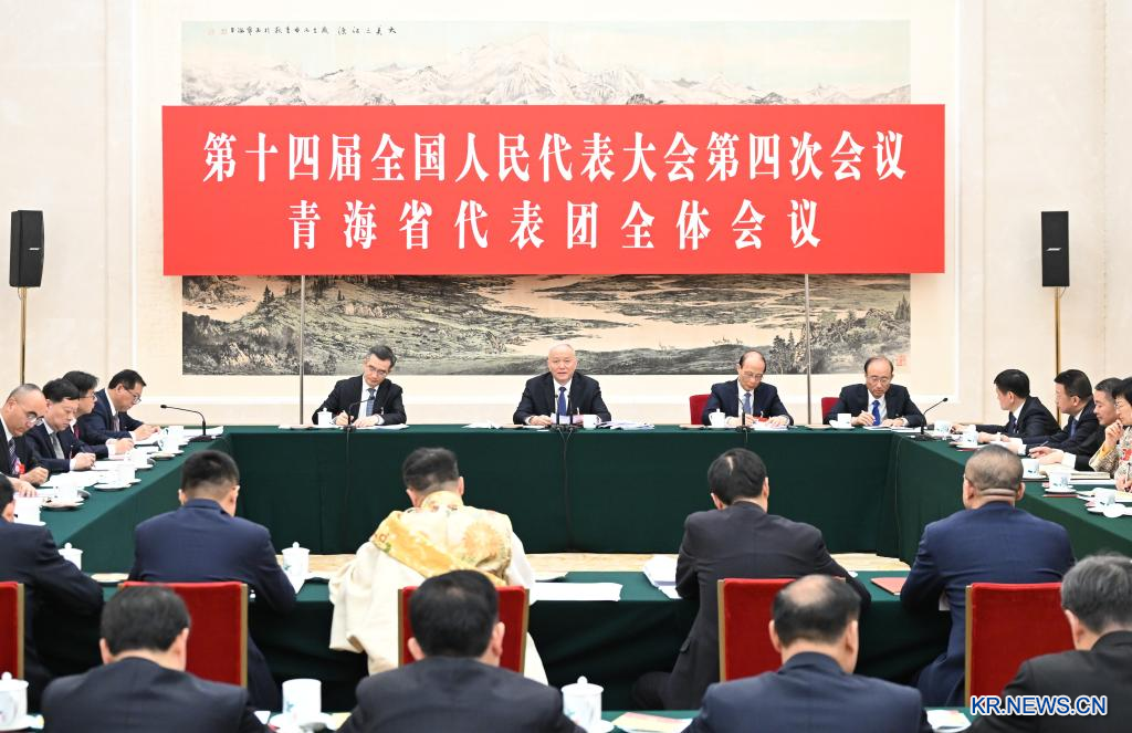 [신화망 베이징 3월8일] 7일 오전 차이치(蔡奇) 중국 공산당 중앙정치국 상무위원, 중앙서기처 서기가 칭하이(青海)성 대표단 심의에 참석해 발언하고 있다. 차이 서기는 칭하이성 대표단 소속이다. [촬영/신화통신 기자 옌옌(燕雁)]