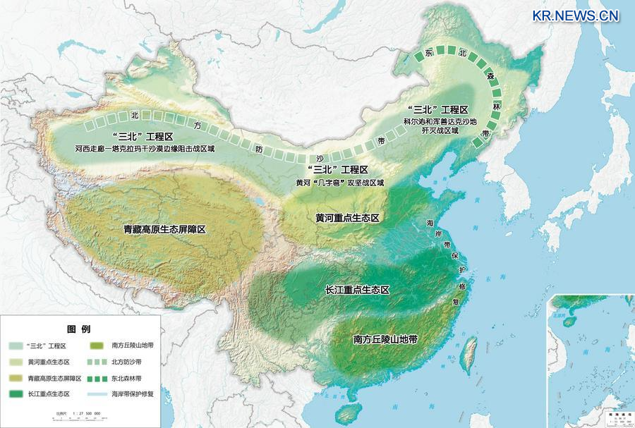 앞으로 5년간 중국은 ▷칭짱(青藏)고원 생태보호구, 황허(黃河) 중점생태구, 창장(長江) 중점생태구+삼북 공정구 ▷동북 산림 벨트, 북방 사막화 방지 벨트, 남방 구릉·산지 벨트, 해안 보호·복원 벨트를 중심으로 생태 안전 보호를 강화·최적화할 방침이다.