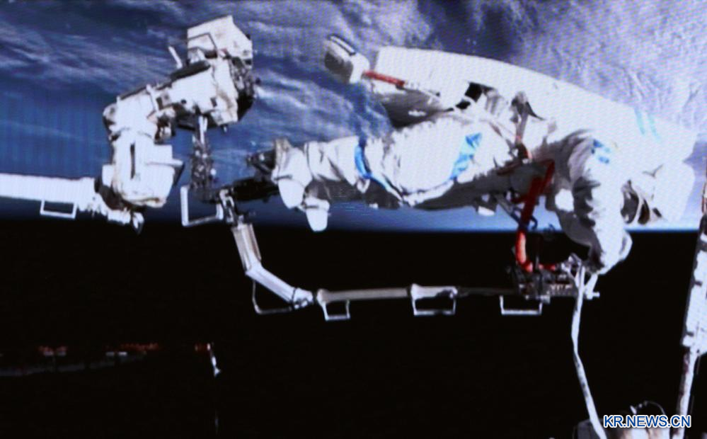 이날 선저우 21호 우주인의 선외 활동 장면이 베이징우주통제센터(BACC) 스크린에 포착됐다. 2026.3.16