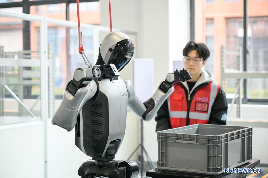 센터의 '택배 분류 시나리오' 구역에서 로봇 트레이너 어우양위안빈(歐陽源彬)이 가상현실(VR) 헤드셋을 착용하고 동작을 취하자 몇 미터 떨어진 곳에서 '워커 S2' 로봇이 실시간으로 그를 따라 움직인다. 로봇은 손을 뻗어 택배를 단단히 잡은 뒤 정확히 다른 테이블 위에 내려놓는다.