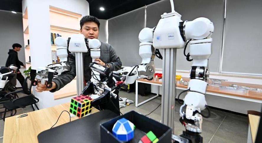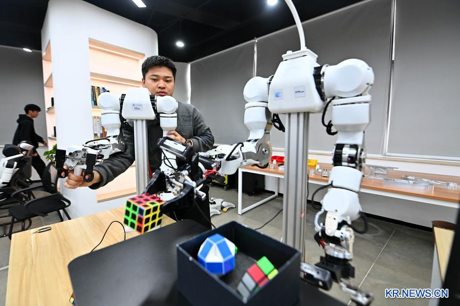 2월 27일 톈진(天津)시 빈하이(濱海) 하이테크산업개발구 소재 무뉴류마(木牛流馬)테크에서 직원이 체화지능 로봇을 테스트하고 있다. (사진/신화통신)