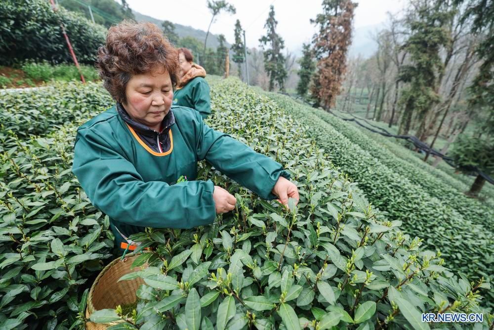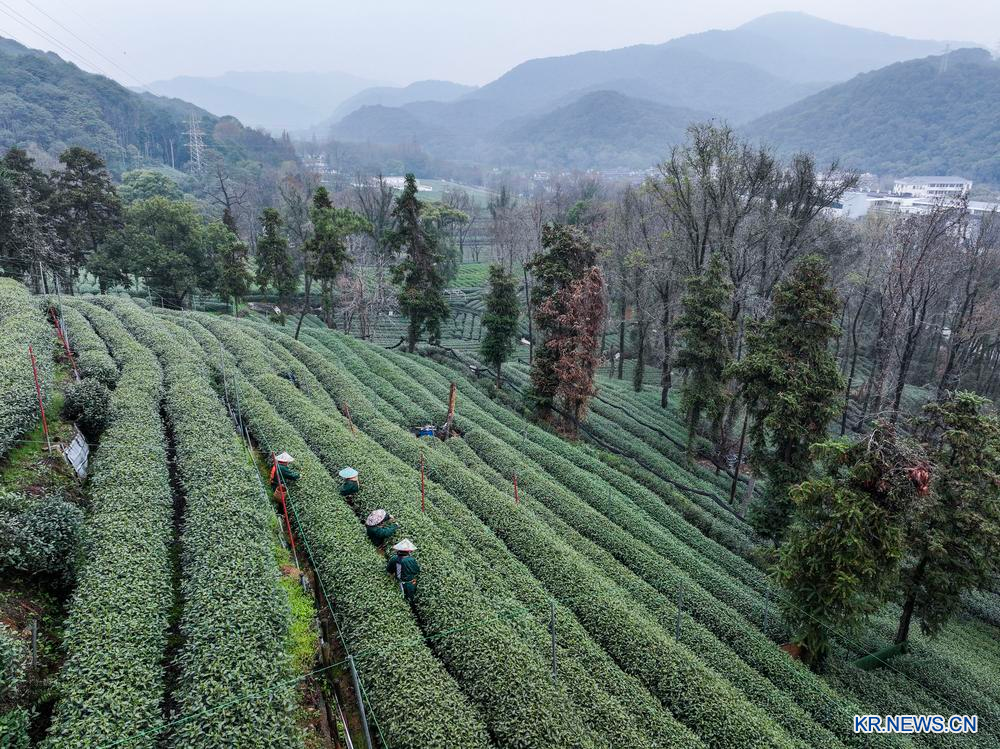 [신화망 중국 항저우 3월20일] 43종의 시후(西湖) 룽징차(龍井茶) 수확이 19일 정식 시작됐다. 저장(浙江)성 항저우(杭州)시 룽징차 1급 보호구의 메이자우(梅家塢)촌, 룽징촌, 웡자산(翁家山)촌 등 차밭에서는 명전차(明前茶·청명 전에 따는 찻잎으로 만든 차) 수확이 한창이다.
