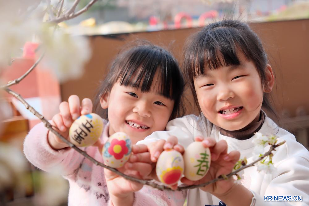 저장(浙江)성 후저우(湖州)시 창싱(長興)현의 유치원생들이 20일 달걀에 그린 그림을 보여주고 있다.