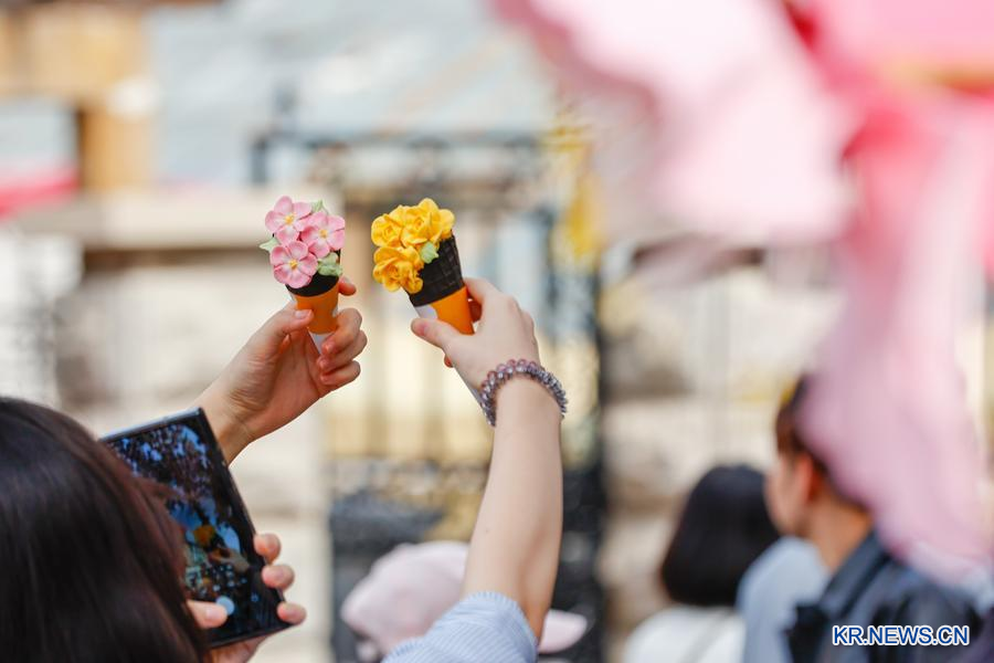 톈진(天津)시 허핑(和平)구 우다다오(五大道) 풍경구에서 관광객이 해당화 모양 아이스크림을 들고 기념촬영을 하고 있다. (사진/신화통신)